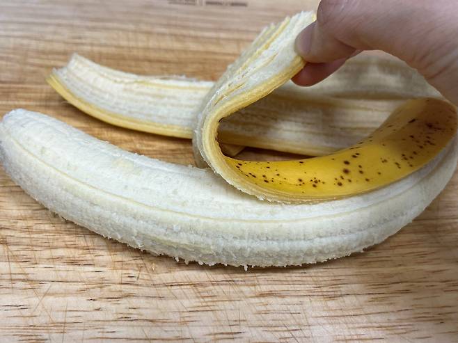 바나나가 물러지기 전 냉동 보관하는 것이 좋습니다. 검은 반점이 조금 올라오더라도 껍질 벗겨보면 아직 단단한데요. 이렇게 잘 익은 상태가 냉동보관하기에 딱 좋습니다. 껍질을 벗겨 주세요.