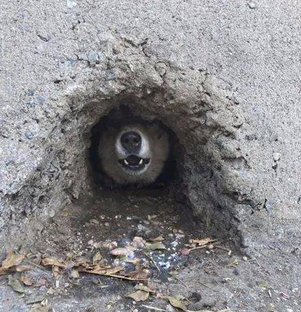 정상적인 강아지라면 머리부터 집어넣다가 끼었을 텐데, 이 허스키는 어떻게 된 건지 몸통이 끼어 있는 모습이라니 정말 이해할 수가 없습니다.