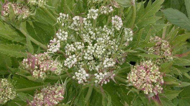 6~7월 사이에 피는 꽃은 하얗고 작은 산형꽃차례를 이루는데, 여러 꽃이 겹쳐 큰 우산을 연상케 한다. 뿌리는 굵고 희며, 약용 가치가 높다.