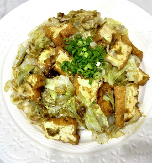 양배추는 너무 오래 익히면 질척거리고 풋내가 나기 때문에 볶을 땐 타이밍이 중요하다. 채를 썰어 준비한 양배추를 볶은 두부 위에 올리고 중불에서 살짝 볶아주되 숨이 죽을 정도까지만 익혀야 한다.
