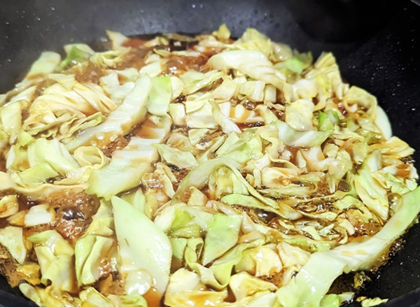 이때 소금을 미리 넣지 않는 것이 좋은데, 소금이 들어가면 양배추에서 수분이 더 많이 나오기 때문에 볶음 전체가 질척해질 수 있다. 숨이 죽고 은은한 단향이 올라오면 다음 양념 단계로 넘어간다.