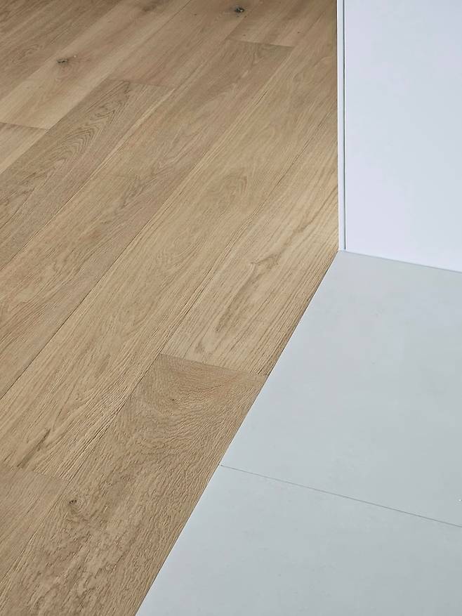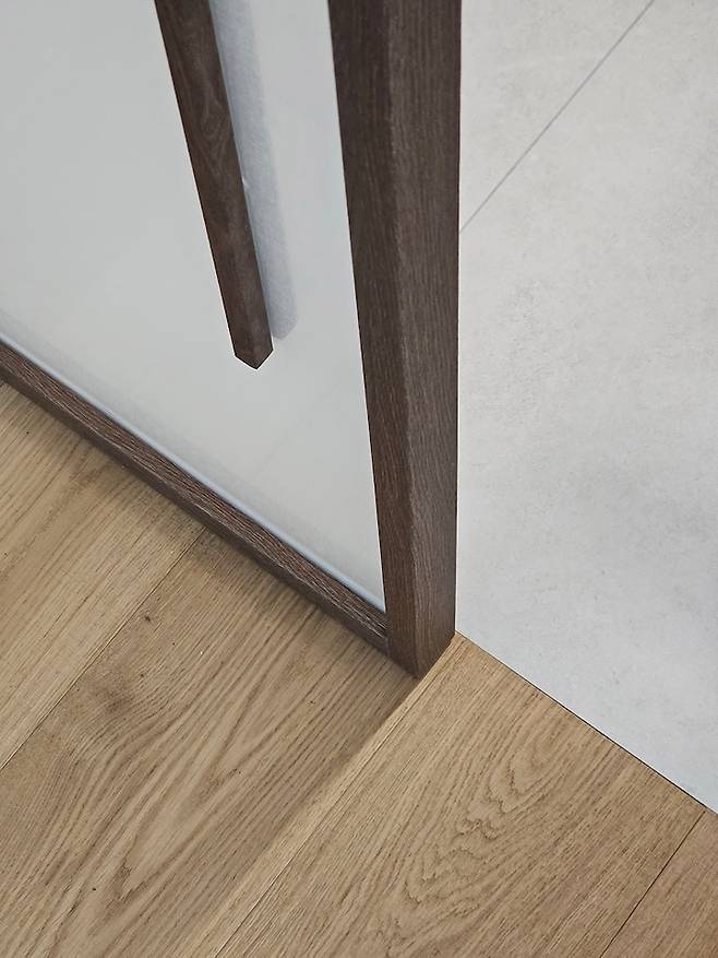 거실과 주방의 구분은 바닥재에서도 포인트를 주었어요. 따듯한 원목과 단정한 타일. 두 자재의 차이가 공간을 깔끔하게 나누어줍니다.