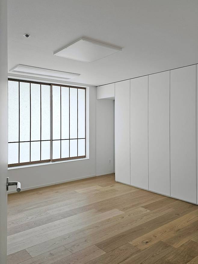 중문은 패브릭접합중문을 시공해 주었어요. 투명한 유리 사이에 더해진 패브릭의 질감이 고요한 느낌을 강조합니다.