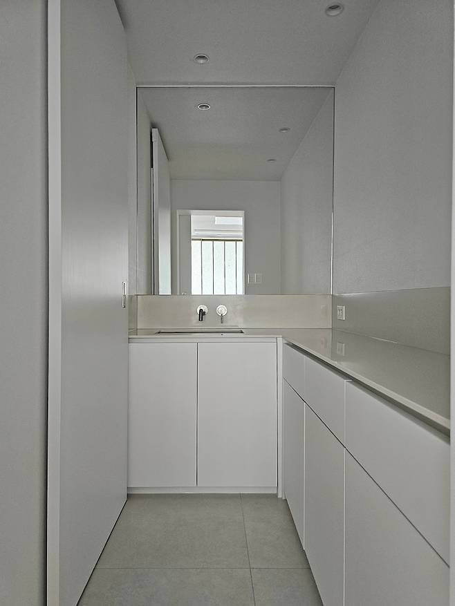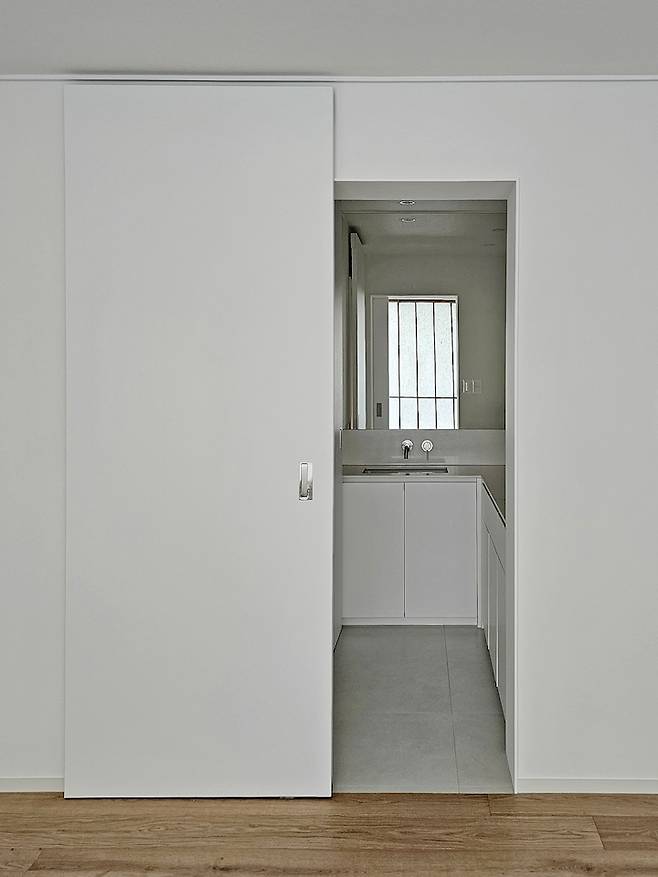 파우더룸과 마찬가지로 높은 공간 활용도를 위해 히든 슬라이딩 도어를 설치하였습니다.