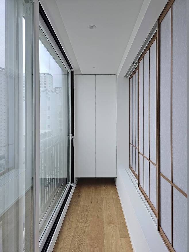 일반 창호 대신 아크릴 한지 중문을 시공했어요. 도심 속의 휴식처로 느껴질 수 있도록 연출했습니다. 창호 앞쪽에는 얕지만 선반을 만들어 화분이나 소품들을 올려 놓으실 수 있도록 구성하였습니다.