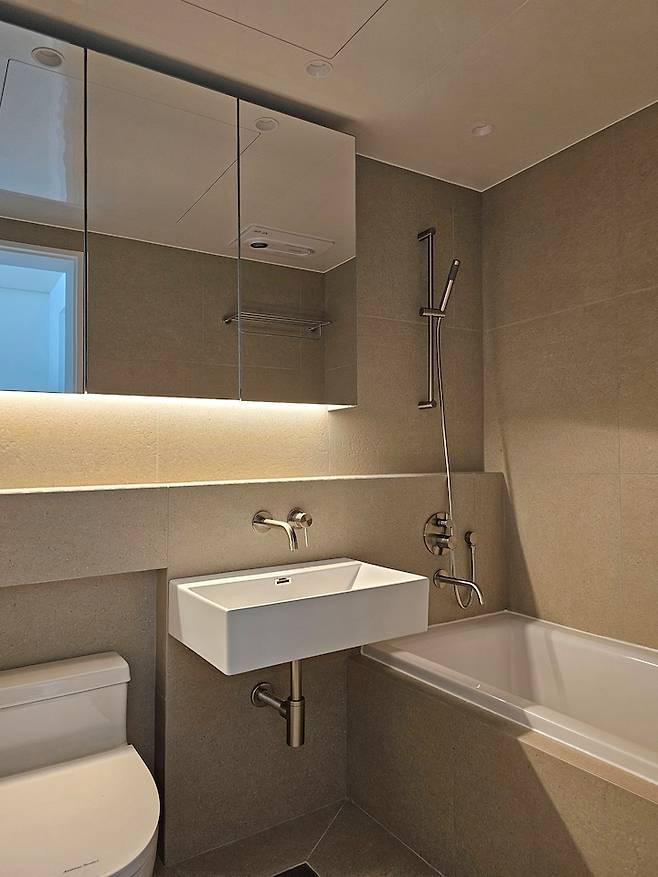 모두 매립수전을 사용하여 고급스러운 무드를 만들었어요. 또 길게 뻗은 젠다이 시공으로 수납 또한 깔끔하게 구성하였습니다. 아늑한 욕실이죠~ 🛁