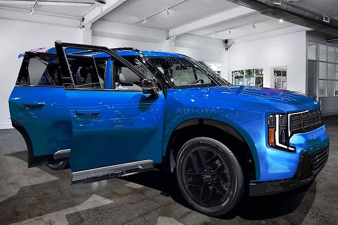 측면부는 박시한 실루엣으로 정통 SUV의 위엄을 드러내며, 단종된 모하비의 강인한 이미지를 현대적으로 재해석한 모습이다.