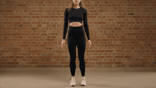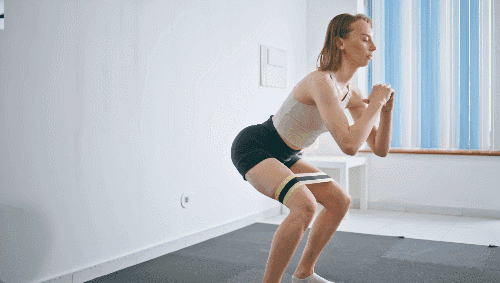 바닥에 서서 준비합니다. 다리는 어깨너비보다 넓게 벌리세요. 손은 머리 옆에 가볍게 올려놓아 자세를 유지합니다. 무릎을 구부리며 스쿼트 동작을 수행합니다. 상체는 구부정하지 않도록 곧게 유지하며 시선은 정면을 바라봅니다.