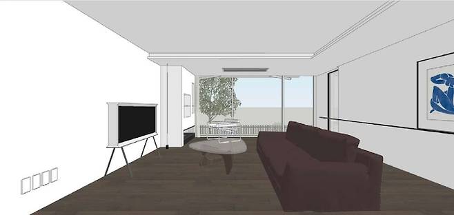 큰 거실을 그저 TV 보는 공간으로만 쓰는 건 너무 아깝더라고요. 벽은 도장 마감하면서 천장 목공도 같이 진행하여 깔끔하게 등박스를 만들고 일부 천장을 내려 시스템 에어컨을 설치했어요.