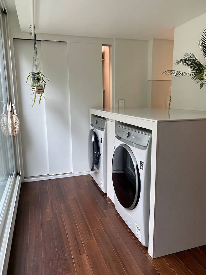 기존 세탁기가 위치했던 곳엔 건조기와 직렬 설치가 불가능해, 보조 주방을 포기하고 그곳에 세탁기기를 빌트인 했어요. 공간은 많이 차지하게 되었지만, 덕분에 세탁물을 바로 개어 올려 둘 수 있는 넓은 상판이 생겼고, 기존의 세탁실은 나머지 주방기기나 청소 도구 등을 수납할 수 있는 공간 겸, 재활용 쓰레기나 세탁물 바구니를 두는 공간으로 바뀌었어요.