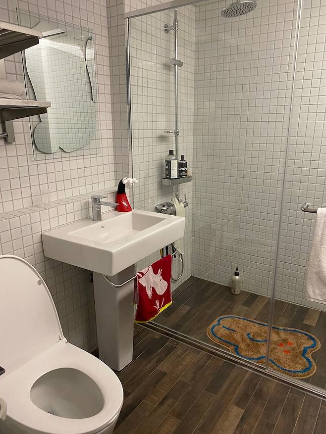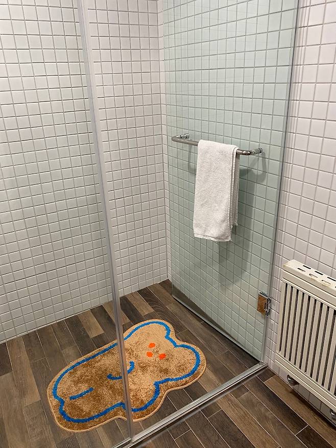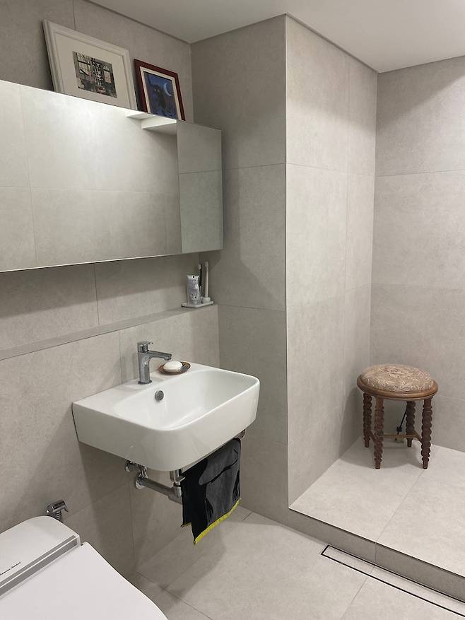 공용 욕실에는 안방 욕실과 다르게 열선대신 기존의 라디에이터를 유지하고, 샤워부스를 설치해 좀 더 캐주얼하게 사용할 수 있도록 했습니다.