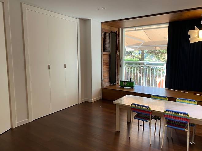 아이들 놀이방이 될 방 한쪽 벽면은 전체가 붙박이장으로 되어있고 내력벽 뒤쪽으로도 장이 하나 있었어요. 아이들 방엔 옷부터 장난감, 잡다한 물건까지, 드러나면 정신없는 것들이 많으니 옷이나 그 외 물건들은 붙박이장에 수납하고 창가 쪽으론 서랍식 평상을 만들어 그곳을 장난감 수납함으로 쓰기로 했어요. 정말 어릴 때부터 쭉 써왔던 책상을 제외하곤 가구를 넣지 않을 거라 아이들이 커가면서 이 방은 조금씩 구성과 용도를 변경해 가며 쓸 예정이에요. 아이들이 마음대로 방에서 정원을 들락날락하기엔 불안한 마음이 있어서 이 방에는 난간을 그대로 두고 정원 출입문을 따로 만들지 않았어요.