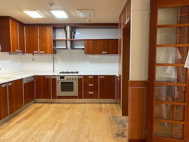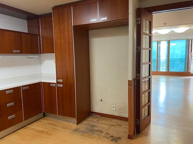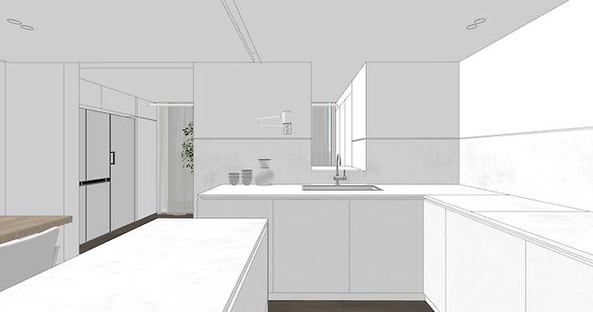 지금의 냉장고와 김치냉장고, 수납장이 위치하게 된 곳입니다. 냉장고가 눈에 띄지 않으면서 편리한 동선에 위치할 최적의 장소였죠. 냉장고들을 빌트인할 수 있는 장을 제작하면서 남은 공간은 깊은 칸막이 수납장을 짜서 식료품 등을 넣는 팬트리 장 대용으로 사용하기로 했어요.