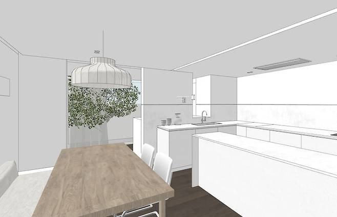 처음 이 집을 만났을 때, 집 안 어느 방향의 창으로도 초록을 볼 수 있다는 점이 저에겐 가장 매력적인 부분이었어요. 로망리스트 중 하나인 햇빛이 쏟아지는 주방을 구현하고 싶어 처음엔 거실과 주방의 공간을 맞바꾸는 계획을 세우기도 했어요. 식구들과도, 손님들과도 거실보단 식탁에 둘러앉아 얘기하며 시간을 많이 보내다 보니 그게 더 실용적일 거라고도 생각했고요. 하지만 현실적으로 불가능한 요소들이 많아 결국 포기하게 되었습니다.