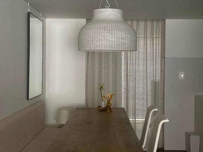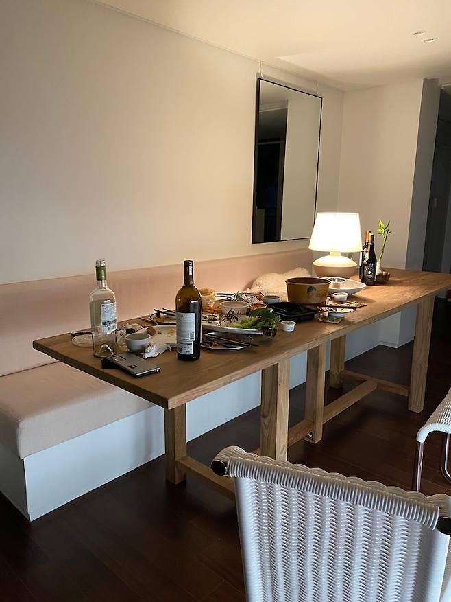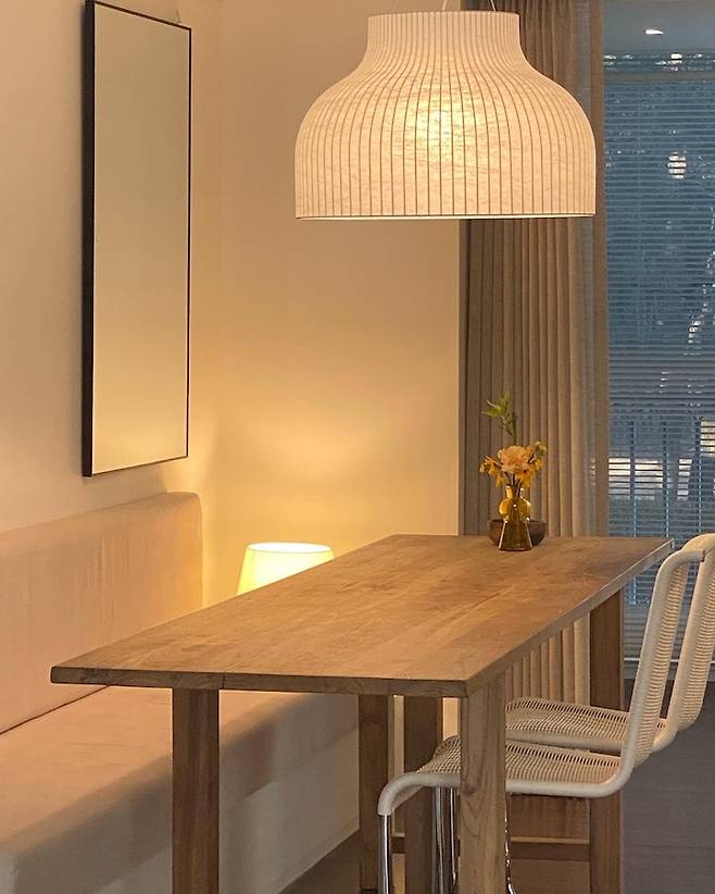 다이닝 존은 전체적으로 눈이 편안한 톤을 선택했고, 고재 식탁은 오일 마감 없이 그대로 써요. 생활 얼룩이 생겨도 그것 또한 정감있게 느껴지는 것 같아요. 얼룩은 식사하고 얘기하다 정리할 때 행주로 닦는 거로 충분해요.