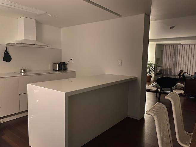 후드와 싱크볼의 위치는 위치 변경이 어려워 거의 비슷한 곳으로 자리 잡았고요, 안으로 들어간 형태의 주방이라 답답할까 석재 텍스쳐가 느껴지는 화이트톤 프리미엄 무늬목에, 빛이 반사되 조금 더 화사해 보일 수 있는 인조대리석 상판으로 주방을 제작했어요. 상판과 같은 소재로 벽면 아래쪽도 둘러 기름때나 얼룩 제거가 편리하게 하였습니다.