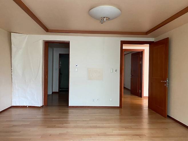 에어컨은 등박스를 만들어 시스템에어컨으로 매립했고, 거실에서 출입하는 문을 제거하고 최대한 출입 공간을 넓혔어요.