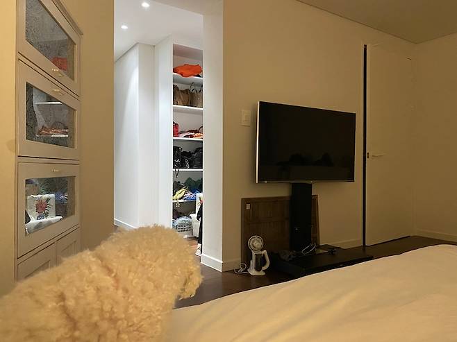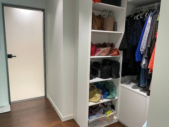 기존의 파우더룸 공간도 드레서로 변경했는데, 여기까지 문이 있는 수납이면 답답해 보일 수도 있을 것 같아 장을 짜서 가방류와 자주 입을 수 있는 옷을 걸어놓는 오픈 형식으로 활용하기로 했구요.