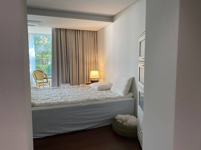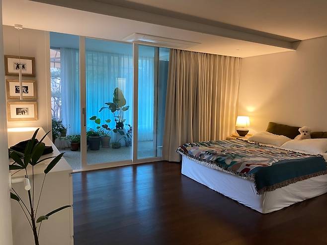 안방도 최대한 심플하게 연출한 건 창밖의 녹음을 방안으로 들여오고 싶었기 때문이에요.