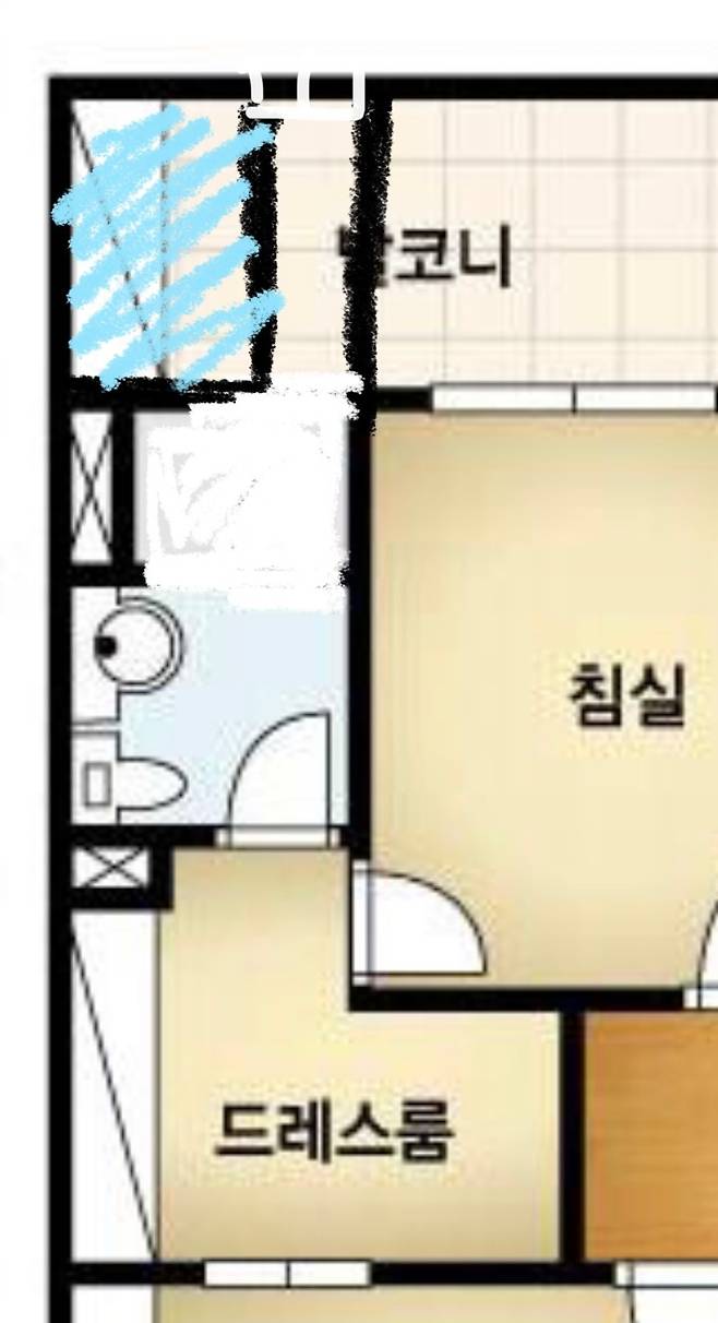 욕실 앞으로 난 문은 작은 방관 연결되는 작은방의 세컨도어 같은 거였는데 공사를 하며 막아버렸어요.