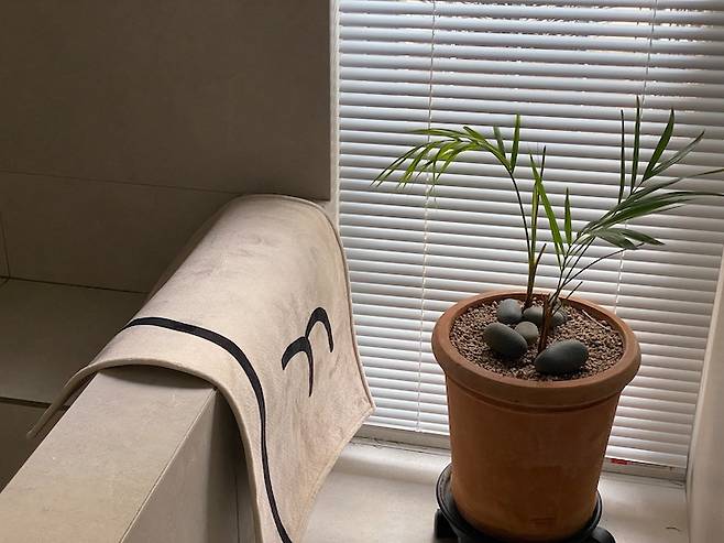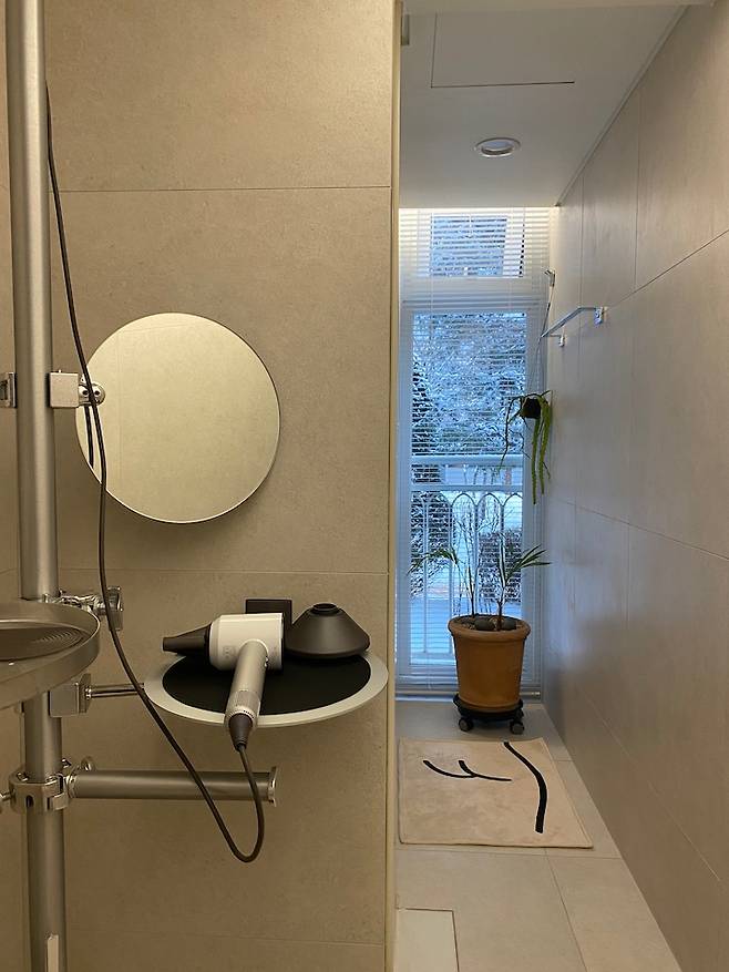 조적 욕조 옆으론 환기가 가능한 창을 내서 욕실에서도 창밖의 풍경을 감상 할 수 있도록 했어요. 안방 베란다 창문을 열고 욕실 환기창을 열면 중간에 위치한 드레스룸까지 환기가 쉽게 되어 참 좋아요. 초록이 보이는 창이 있는 욕실을 갖는 게 저의 로망 리스트 중 하나였지요. 바닥엔 열선을 깔아 언제나 발바닥이 따뜻한 욕실이에요.