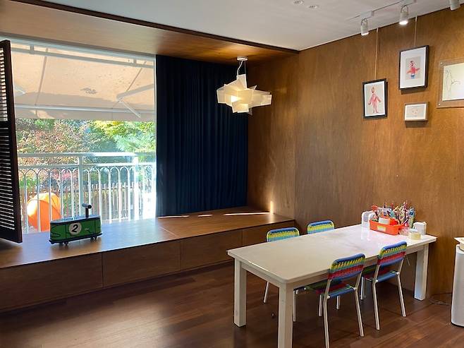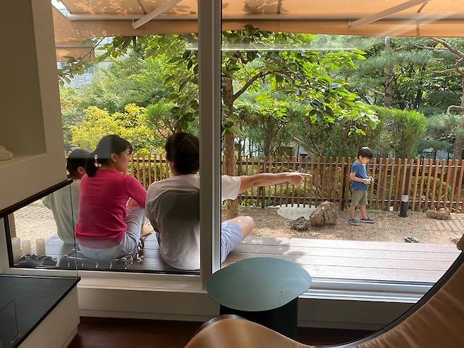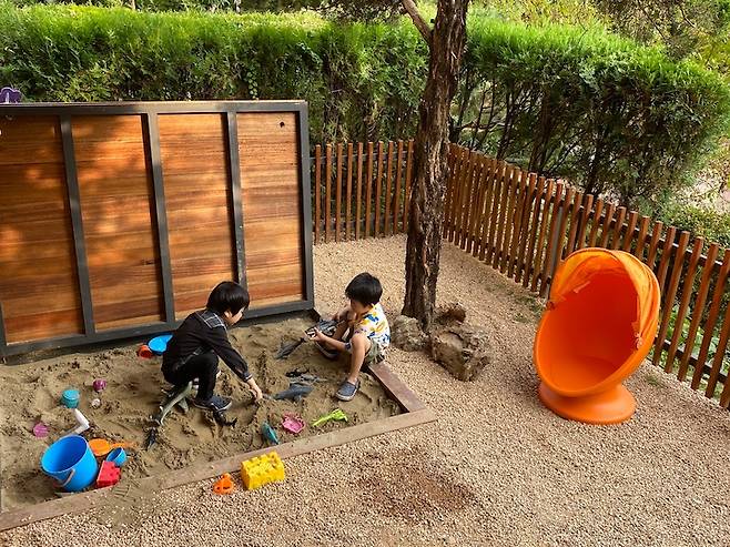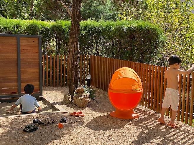 아이들 방 앞쪽 정원엔 모래 놀이터가 있어, 키즈존이 안팎으로 연결되는 것 또한 이 방의 재미있는 요소 중 하나예요.