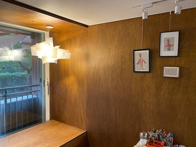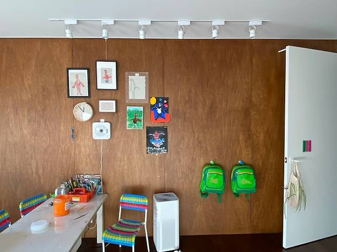 메인 직부등 없이 레일등과 팬던트 조명을 믹스했어요. 합판 벽은 아이들이 마음껏 작품을 붙였다 떼었다 할 수 있는 게 참 좋은 것 같아요.