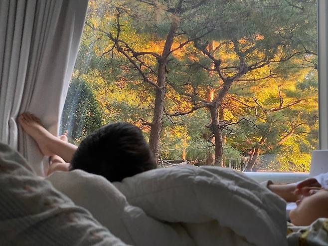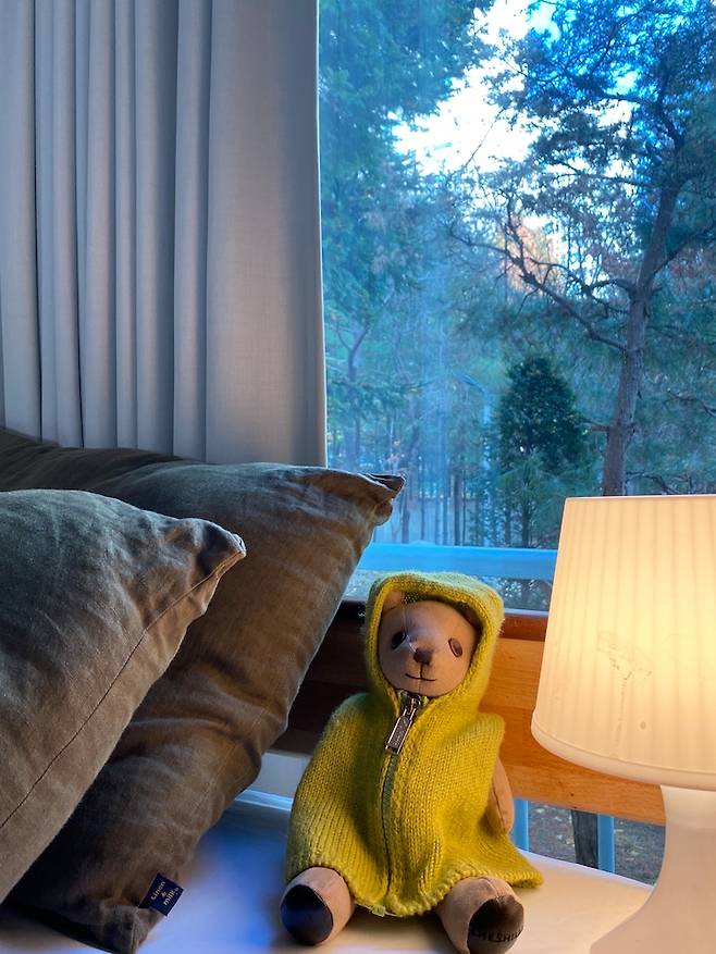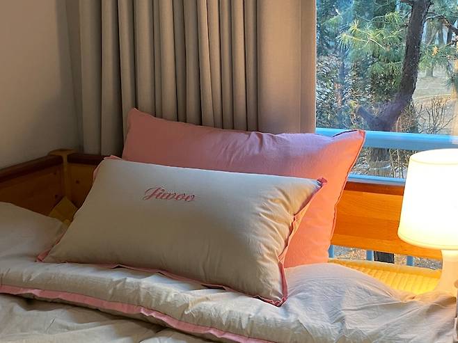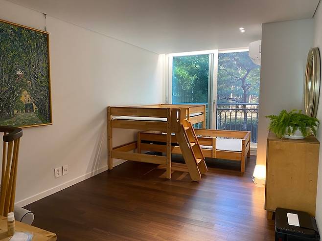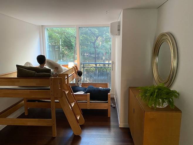 공간 활용을 위해 낮은 2층 침대를 들여 주었습니다. 침대 밖 창문으로 가득한 나무들을 보고 있으면 참 싱그러워요.