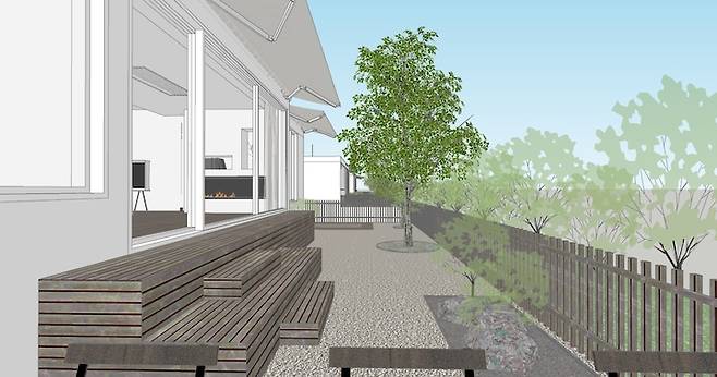 시안에 보이는 잔디 부분은 다 삭제했어요. 아이들과 강아지도 있어 정원까지 관리하는 건 현실적으로 어려울 것 같아 베이지색 자갈 마감으로 부탁드렸고 혹시 잡풀이 올라올까 자갈 아래쪽에 부직포 작업, 그리고 정원 사용을 더 다양하게 해 줄 콘센트와 수도, 어닝, 실내에서 온오프 가능한 조명 작업도 요청드렸어요.