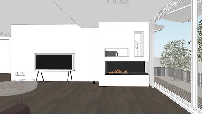 확장 후 남아있던 벽은 철거가 불가능해, 벽의 쉐입을 이용해 벽난로 제작을 부탁드렸어요.