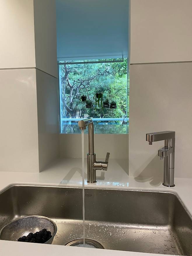 싱크대 위로 난 창은 오픈 창으로 최대한 터서 밖의 풍경을 설거지하면서도 볼 수 있도록 했던 건데, 공사 도중 주방과 같은 높이로 계획했던 싱크대 뒤쪽의 보조 주방이 세탁기, 건조기 장으로 변하면서 더 높아져 버렸고 그렇게 주방과 단차로 인해 창엔 턱이 생기게 되었어요. 턱이 없었다면 더 뷰도 더 시원하고 좋았을텐데, 속상했지만 지내다 보니 나름의 매력으로 느껴지기도 해요. 창밖의 초록은 주방일을 하면서도 문득문득 창밖을 보게 해요.