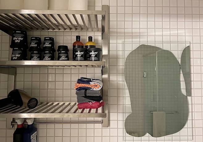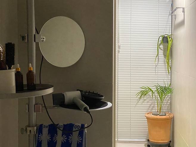 파우더룸 공간이 따로 없어 기존의 샤워 공간 이었던, 스툴이 놓인 위치에 행거형 선반과 거울을 두고 사용할 예정이었는데 제품이 좀 늦게 도착했네요.