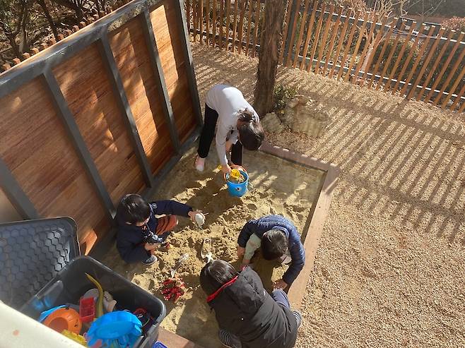 아이들 방 앞쪽으론 뚜껑을 여닫을 수 있는 모래 놀이터를 만들었어요.