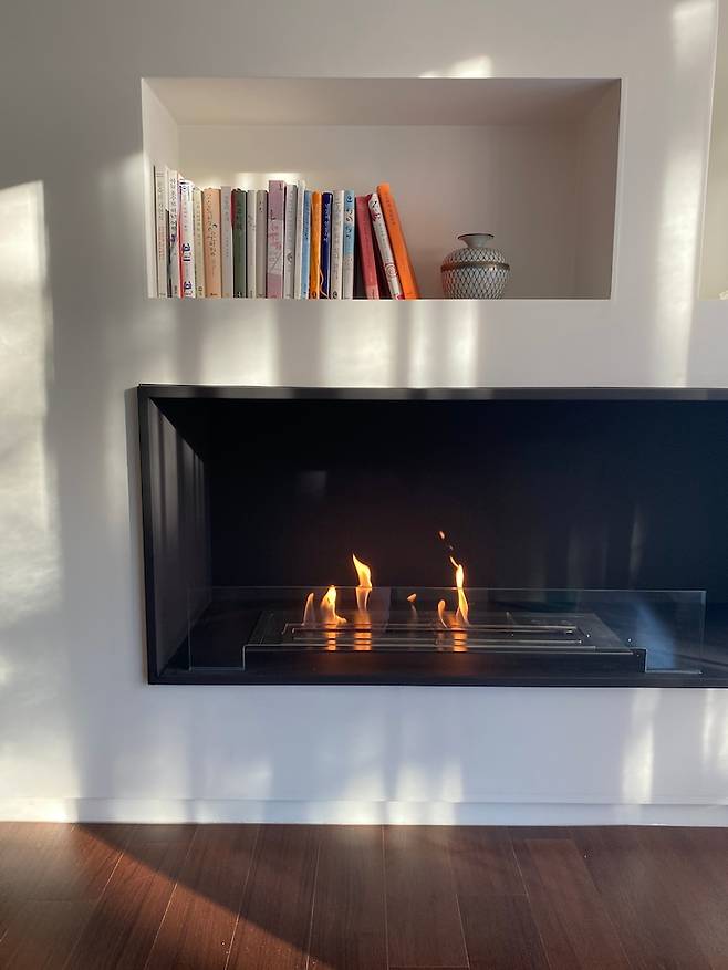 난로 위로는 수납공간을 만들어 오브제를 올려두거나 자주 읽는 책을 꽂아두는 용도로 사용해요.