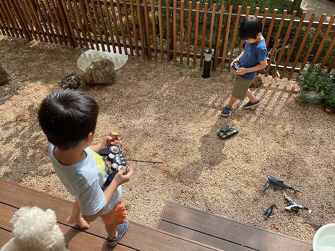 정원은 이사 온 이후로 한겨울이 되기까지, 매일이 아이들의 놀이터가 되어 주었어요. 잠자리 채를 들고 다니며 벌레를 잡아서 관찰하기도 하고, 물놀이를 하기도 하고, 남은 감을 먹으러 오는 까치를 반가워하기도 하고, 그렇게 하루도 빠뜨리지 않고 들락날락 신나게 노는 모습을 보면 어른들도 덩달아 행복했죠.