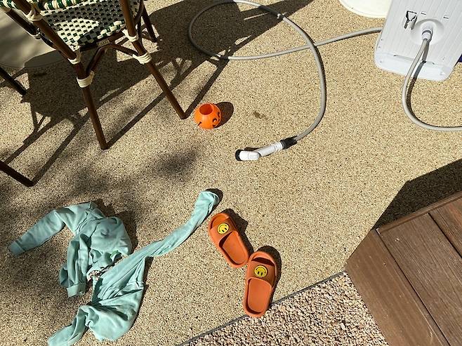 베란다는 타일 대신 콩자갈로 마감했어요. 내부지만 외부의 자연스러운 느낌을 연출하고 싶었거든요. 발에 닿는 감촉도 좋고 배수도 원활해, 여름 해가 너무 뜨거울 땐 여기에 아이들 간이 수영장을 만들어주려 해요.