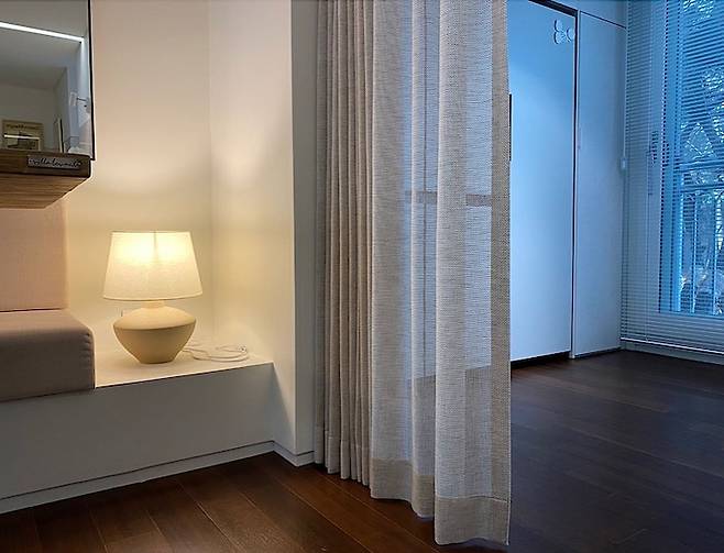 안방 커튼은 오트밀과 그레이 빛이 살짝 도는 암막 커튼으로 편안하게 연출하고 기존의 창이었던 곳은 아래쪽 벽을 터, 안방에서 베란다 출입이 가능하도록 변경했어요.