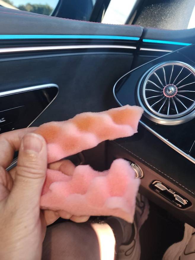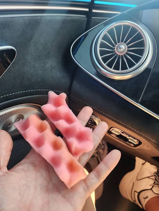 글쓴이 ‘여수공룡’는 게시글에서 “벤츠 EQS의 하이퍼스크린 송풍구 쪽에서 잡소리가 너무 심해서 한 달 반을 기다려 센터에서 보증수리를 받고 왔다”면서 “수리를 받으려고 센터에서 7시간이나 대기했는데, 분홍색 스펀지 하나 껴줬다”라고 비판했다.