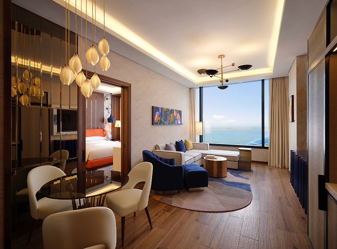 리조트 내부는 흰색과 골드 톤으로 꾸며져 있어 화사한 분위기를 물씬 풍긴다. 로비 복도를 따라 걷다 보면 고급스러운 카페와 기념품 숍, 다양한 레스토랑이 자리해 있어 한곳에서 온전히 시간을 보내도 좋을 만큼 편의 시설이 충실하다. 특히 내부의 휴게 라운지나 중앙 광장은 날씨와 상관없이 쾌적하게 머물기 좋아 인기가 높다.
