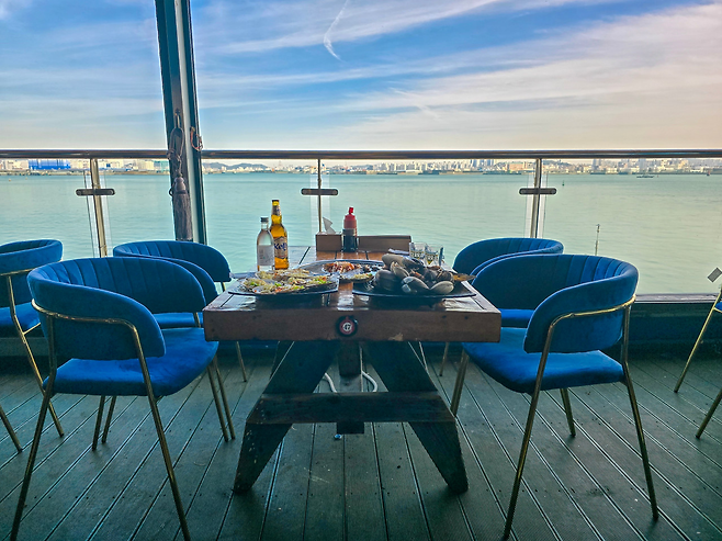 가게 이름에 걸맞게 세 면이 통유리창으로 꾸며져 있어, 넓은 창문 너머로 탁 트인 바다 전경을 바라보며 식사를 즐길 수 있다. 바닷바람이 부는 구읍뱃터 일대를 조망하다 보면 어느새 해안가를 거니는 듯한 기분이 들며, 일상 속 스트레스가 한결 사라진다.
