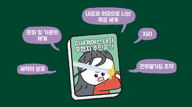 이러한 무협 소설을 보면 이야기의 전개 방식은 다양하나 변하지 않는 공통 설정이 존재합니다. 주로 무림을 이루는 세력의 분포나 문파 및 가문의 체계, 내공과 외공으로 나뉜 무공 세계, 지리, 황실과 강호무림은 서로의 영역을 침범하지 않는다는 관무불가침 조약 등이 해당합니다.