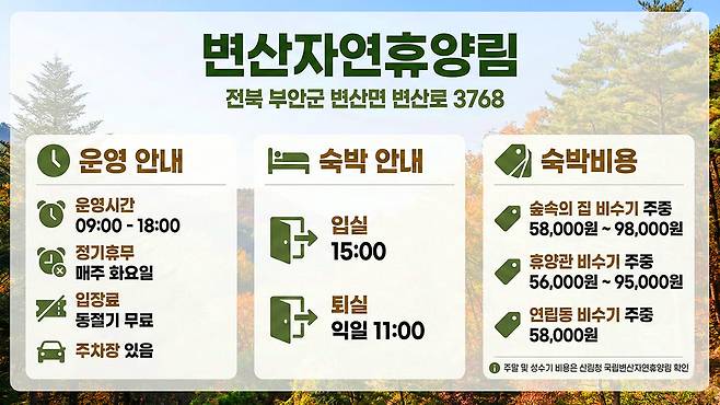 💰 숙박 요금: 비수기 평일 기준 휴양관 56,000원 / 숲속의 집 58,000원부터
