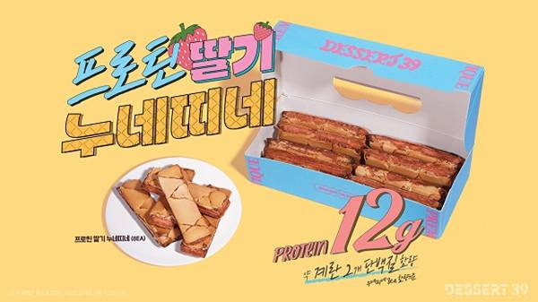 디저트39는 SPC삼립과 오랜 연구를 통해 개발한 헬시 플레저 트렌드 상품으로 ‘프로틴 딸기 누네띠네’를 출시했다. 8개가 든 패키지 구성의 제품으로, 프로틴이 8개 기준 12g 함유됐다. 상큼한 딸기 페이스트리와 달콤한 글레이즈가 조화를 이뤄, 단백질 특유의 맛과 냄새를 줄였다. 단백질이 함유된 바삭하고 상큼한 누네띠네를 만들기 위해 여러 번의 테스트를 거친 것으로 전해진다. 가격은 3,500원이다.