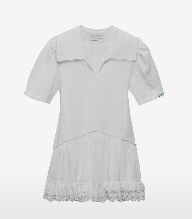 정시아가 선택한 화이트 미니 원피스는 전체적으로 루즈한 실루엣과 섬세한 레이스 디테일이 특징이다.