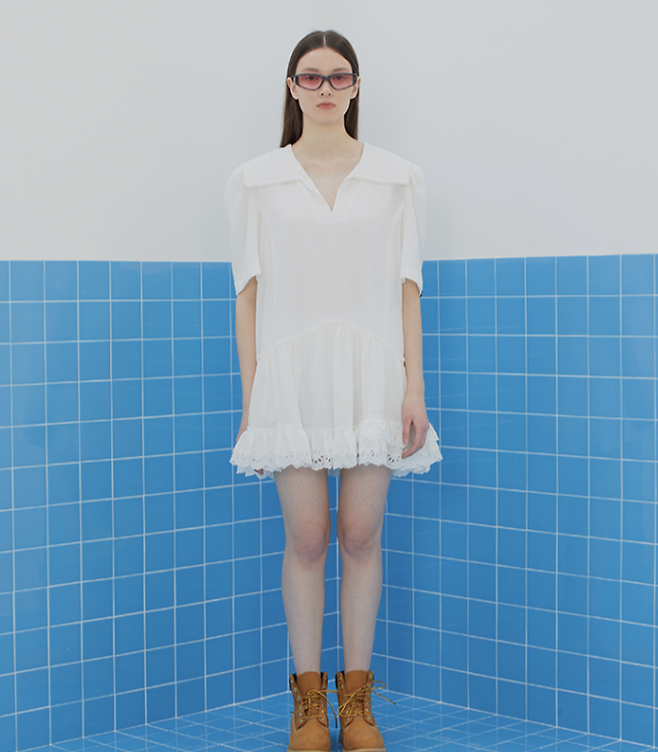 페미닌하면서도 클래식한 감성이 돋보이는 아이템으로, 넓은 세일러 카라와 프릴, 진주 버튼 등 디테일이 더해져 우아하면서도 사랑스러운 분위기를 연출한다.
