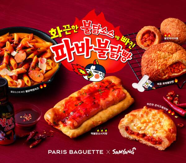 파리바게뜨는 삼양식품의 불닭소스와 콜라보한 제품을 선보이고 있다. 삼양식품과 협업을 통해 출시된 신제품은 ‘파바불닭빵’을 비롯한 신제품 5종이다. 불닭소스의 화끈한 매콤함을 즐길 수 있는 빵 4종(화끈한 콘치즈불닭빵, 매콤 로제불닭빵, 불닭 파이어볼, 핵불닭소시지빵)과 가정간편식 1종(불닭소스에 빠진 불닭맥앤치즈)이다. 파리바게뜨는 불닭소스 특유의 중독성 강한 매운맛을 잘 살린 제품들이라 신메뉴를 설명하고 있다.