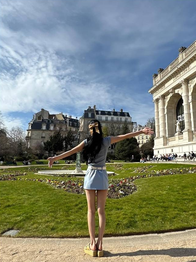 있지 예지가 하늘빛 니트 민소매와 미니스커트로 슬림한 실루엣의 바캉스룩을 완성했습니다.