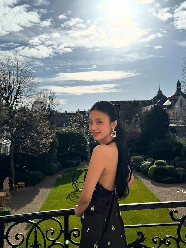 풍성하게 웨이브진 긴 흑발에 리본을 더해 소녀미를 배가시켰으며, 팔을 쭉 뻗은 자연스러운 포즈가 자유로운 분위기를 연출했습니다.