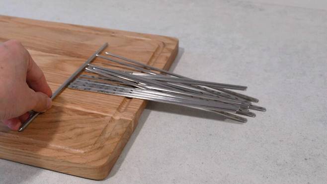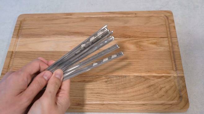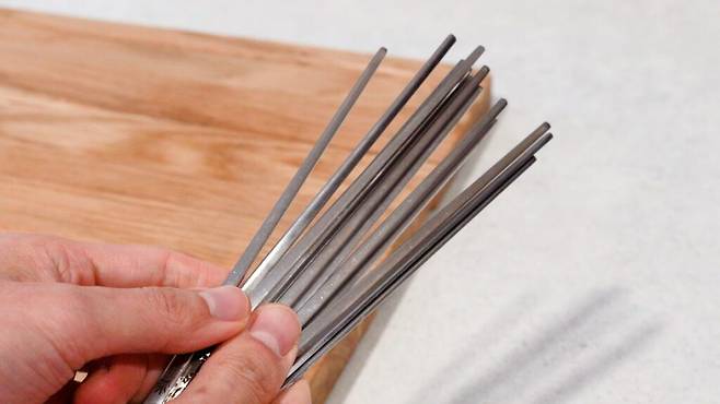 이제는 젓가락을 사진처럼 도마에 올려 보세요. 그리고 바깥쪽으로 밀어줍니다. 그러면 상대적으로 무거운 젓가락 윗부분이 먼저 바닥으로 떨어지게 되는데요. 나머지 부분을 손으로 잡아 정리해 보세요.