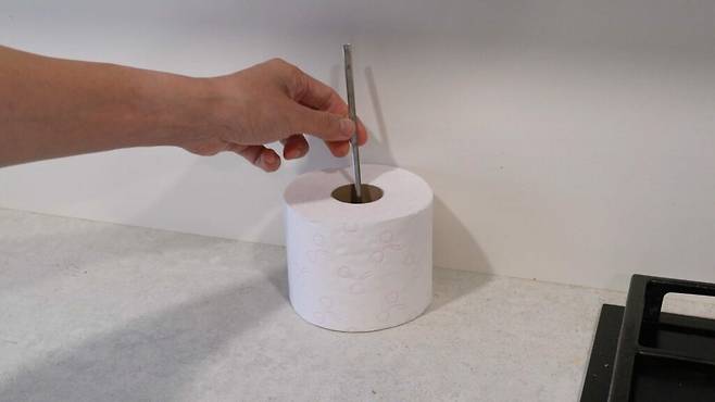 이럴 땐 먼저 두루마리 휴지 하나를 준비하세요. 두루마리 휴지심에 젓가락 하나를 꽂아 줍니다.